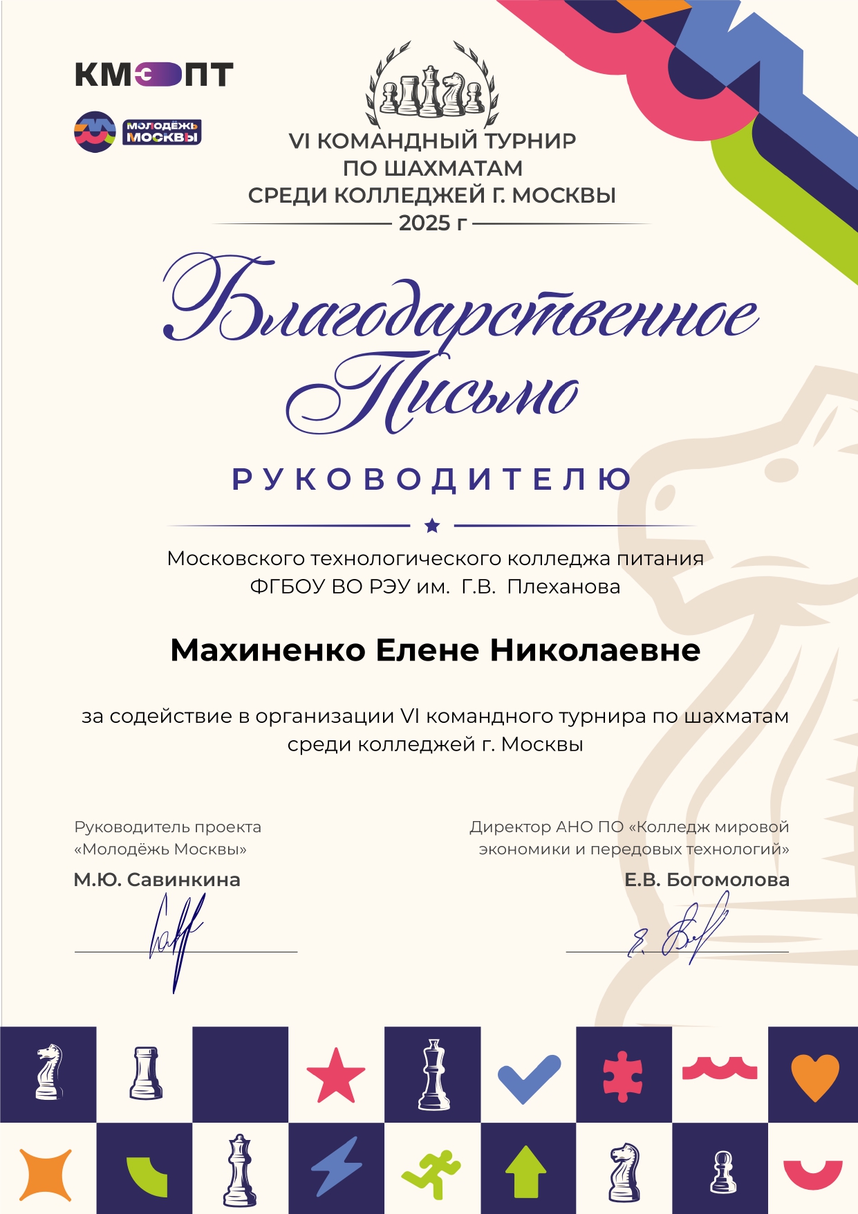 Благодарственное письмо директору Московского технологического колледжа питания РЭУ им. Г.В. Плеханова Е.Н. Махиненко!