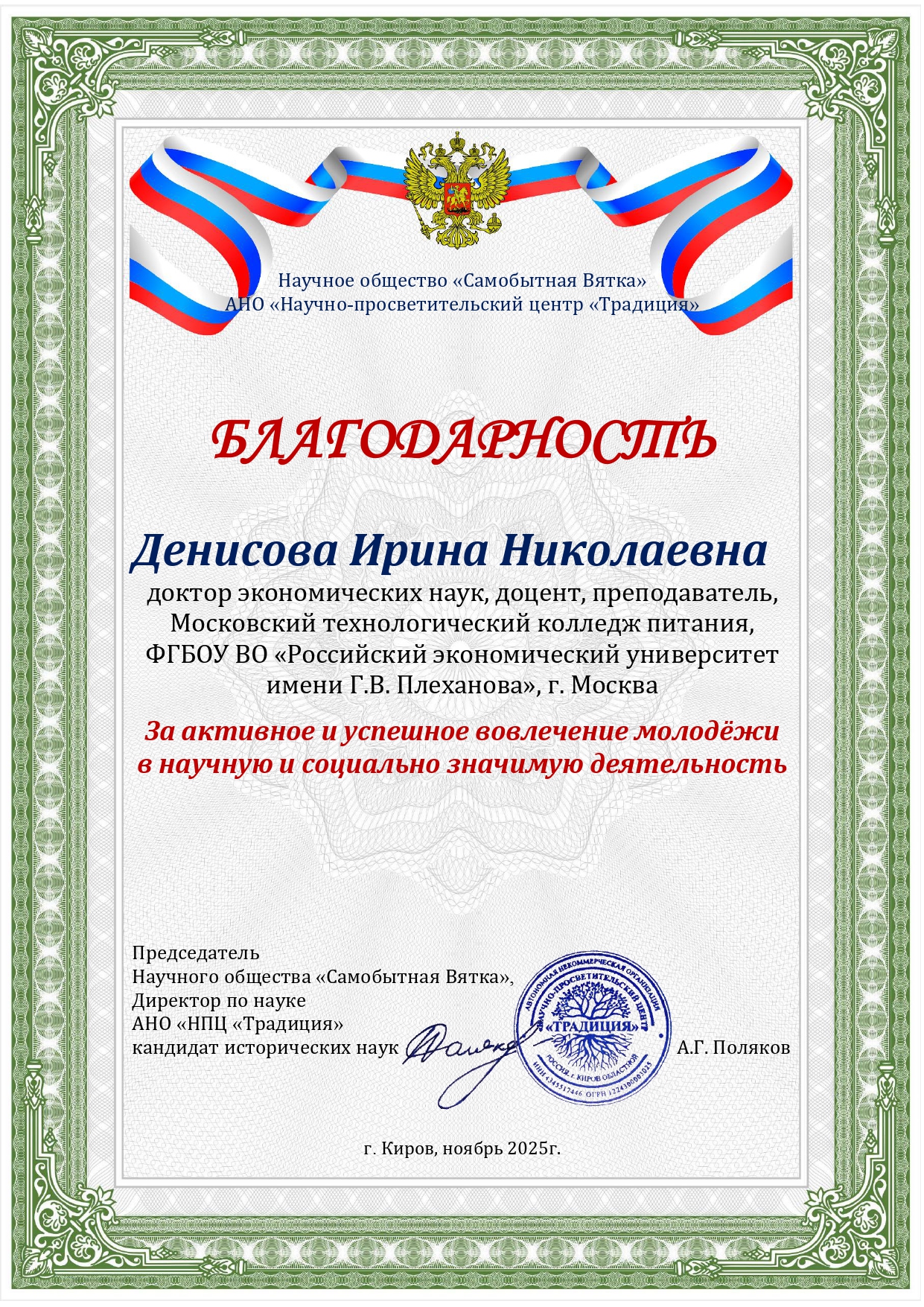 Благодарность Денисовой И.Н. за активное и успешное вовлечение молодёжи в научную