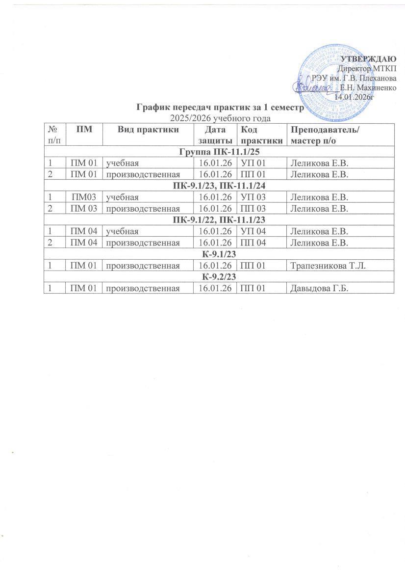 Календарный учебный график МТКП РЭУ им. Г.В. Плеханова на 2025-2026 учебный год