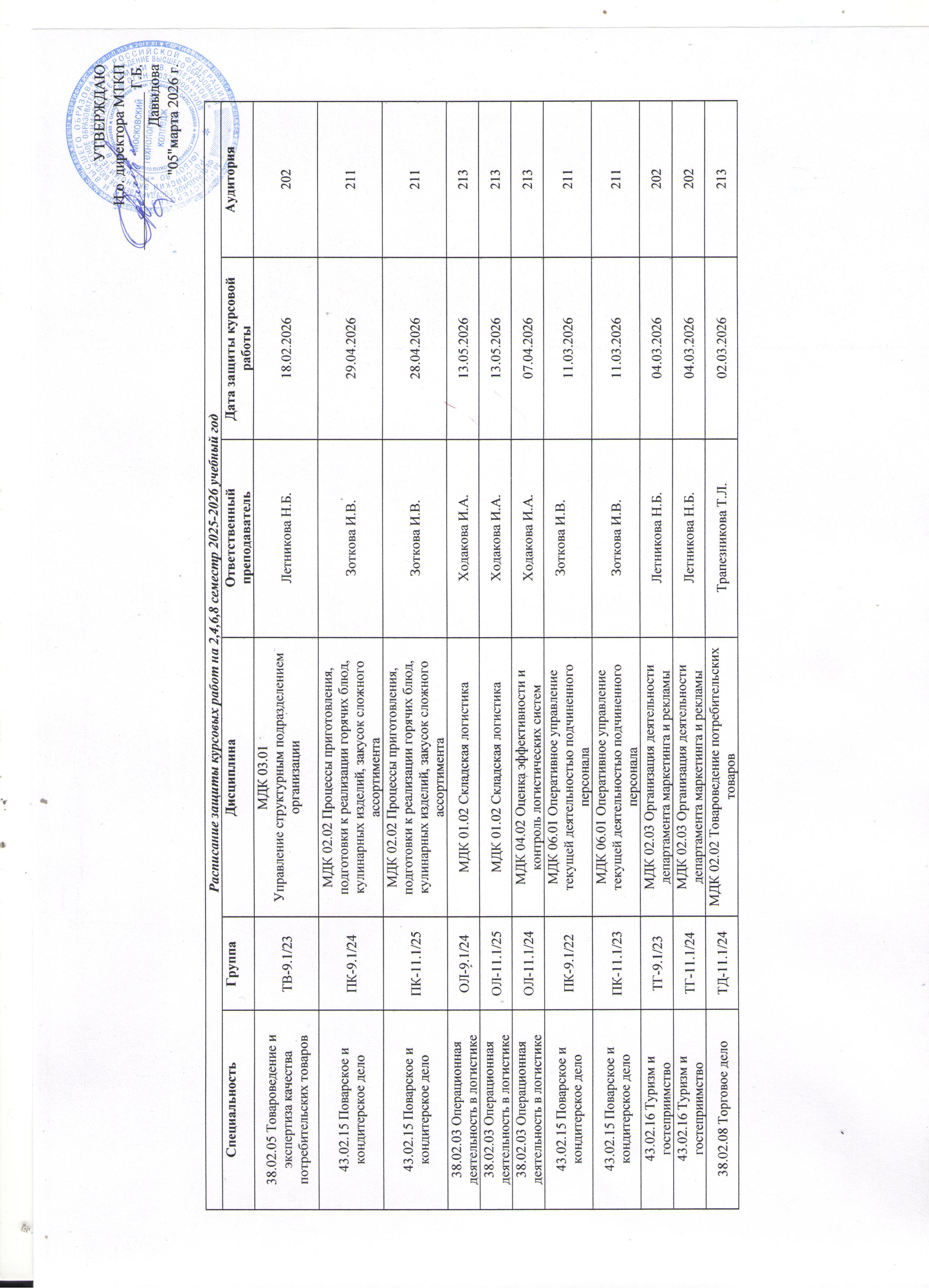 График защиты курсовых работ на 2025-2026 учебный год